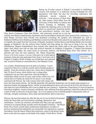 This document summarizes the author's trip to Poland in 2003 to attend the International Council of Archives seminar in Warsaw and Krakow. Over the four day seminar, archivists from across Europe and a few from other regions met to discuss strategies for acquiring archival materials, access and outreach. The author enjoyed touring historic sites in both cities like Wilanow Castle and the Old Town in Warsaw, and Wawel Hill and St. Mary's Church in Krakow. The author was able to make contacts with many of the other archivists in attendance and gained an appreciation for Polish history, culture and the resilience of its people.