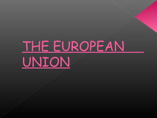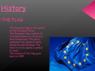 The European Union was formed after World War 2 to promote unity and prevent future wars. It has expanded from 6 original members to 27 current members. Key treaties and agreements over the years have increased integration, including establishing a common currency, the euro. The EU has a flag featuring 12 stars, and an anthem based on Beethoven's 9th Symphony. It aims to promote economic cooperation and environmental protection among its members.