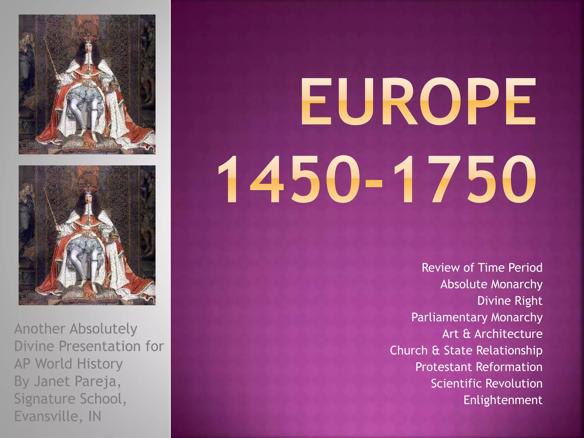 This document provides an overview of major developments in Europe between 1450-1750, including the Protestant Reformation, Scientific Revolution, Enlightenment, rise of absolute monarchy and new economic systems. It discusses changes in religion, politics, society, culture, science and philosophy that transformed Europe during this period. Key events and thinkers such as Martin Luther, Galileo, Descartes, Locke, Adam Smith and others are summarized along with the impact of their ideas.