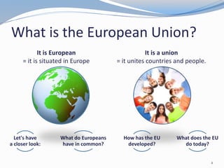 The European Union is an economic and political union of 28 European countries that provides its 500 million citizens with opportunities for education, work, travel, and cultural exchange. It was established after World War 2 to foster cooperation among European nations and prevent future conflicts. Starting with 6 founding members, it has expanded over the decades and now works together on issues like trade, climate, education, and regional development to improve life for all Europeans. Key EU institutions include the European Commission, Parliament, Council and Court of Justice which work to propose and pass laws and policies for the union.