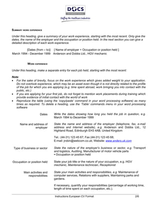 The document provides detailed instructions for completing various sections of a European curriculum vitae, including personal information, work experience, education and training, and personal skills. Sections should include name, address, telephone number, dates of employment, employer names and addresses, occupations, responsibilities, course names and dates, qualifications obtained, subjects covered, and language proficiency levels. Descriptions of work experience and education should focus on qualifications and skills relevant to the job being applied for.
