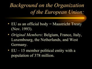 The document provides an overview of the key institutions and treaties of the European Union (EU). It describes the EU's origins in 1993 with the Maastricht Treaty and lists its five major institutions: the European Commission, Council, Parliament, Court of Justice, and Court of Auditors. It also summarizes several important founding treaties, including the Treaty of Paris (1951), Treaty of Rome (1957), and Treaty of Maastricht (1993). Finally, it provides resources for researching EU law and treaties.