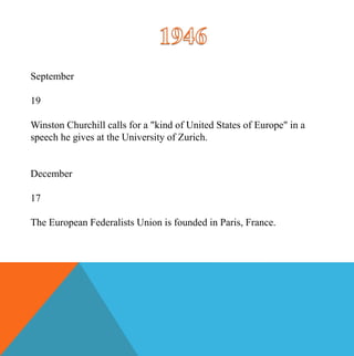 Winston Churchill calls for a "United States of Europe" in a 1947 speech. Over the following years, several organizations are founded to promote European unity and integration, including the European Federalists Union, United Europe Movement, French Council for a United Europe, Socialist United States of Europe Movement, and European Union of Christian Democrats. The Marshall Plan is also announced to provide economic support for post-war Europe.