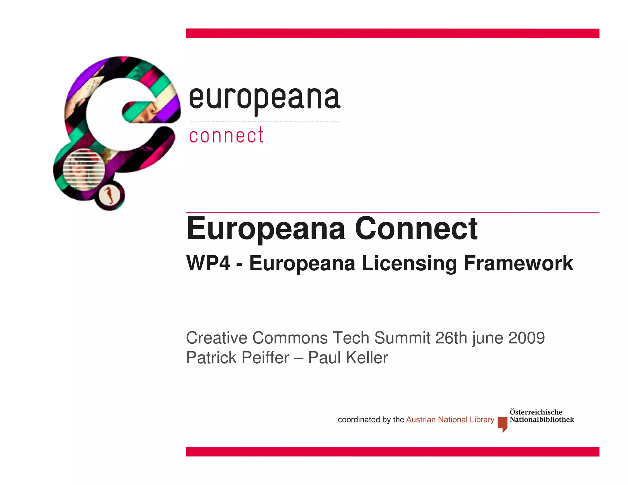 This document discusses the Europeana Licensing Framework project which aims to (1) develop a pragmatic licensing framework for content in Europeana by summer 2010, (2) validate the framework through consultation, and (3) describe the three public domains and tools for marking up content with the applicable licensing information. The framework will focus on licensing metadata and objects within Europeana to define rights and ensure compliance. It will also link to discussions on interoperability with external registries and a solution was found for asserting public domain status by authoritative organizations uploading content via OAI-PMH. Tools to be built include a license selection tool and public domain helper tool.