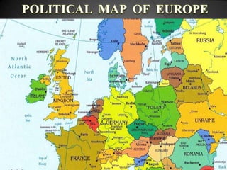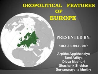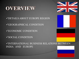 This document provides an overview of the key geopolitical features of Europe. It discusses Europe's geographical conditions, large population and economy, dominant religion of Christianity, and social models. The presentation also outlines international business relations between Europe and India, noting that the EU is India's largest trading partner and trade has more than doubled between 2000 and 2007.