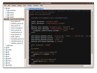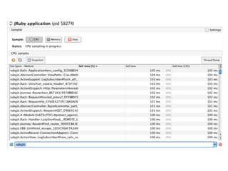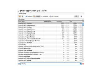 The document discusses JRuby, a Ruby implementation on the Java Virtual Machine (JVM), highlighting its compatibility with Ruby versions 1.8 and 1.9, performance improvements, and features like garbage collection and threading. It mentions the JRuby team and their achievements, including Google Summer of Code participation, and details about tools available for profiling and monitoring Java applications. Ultimately, it invites developers to try JRuby and contribute to its ongoing improvement.
