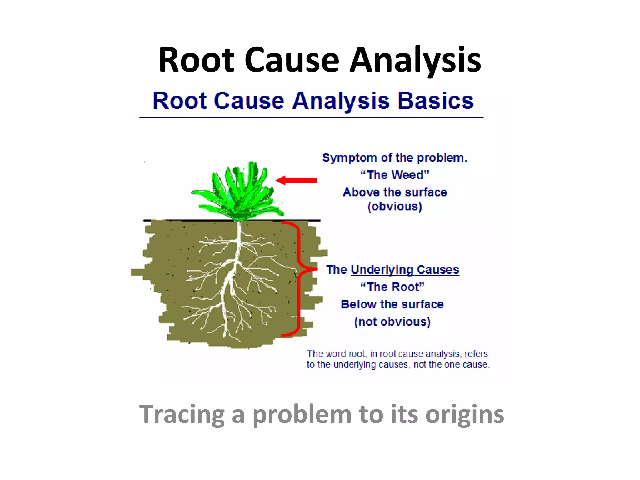 This document outlines a 5-step process for performing a root cause analysis: 1) Define the problem by describing symptoms and what is observed. 2) Collect data on how long the problem has existed, its impact, and different perspectives using a CATWOE analysis. 3) Identify possible causal factors using tools like appreciation, 5 whys, drill down, and cause-and-effect diagrams. 4) Identify the root cause of why the causal factor exists. 5) Recommend and implement solutions to prevent future occurrences, assign responsibilities, and manage risks, using continuous improvement strategies like kaizen. It provides an example task to diagnose a network printing problem at CycleWorld using this root cause analysis model.