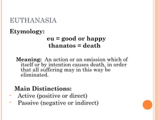 Euthanasia refers to actions or omissions that cause a person's death in order to end suffering. There are two main types: active euthanasia directly ends a person's life through lethal injection for example, while passive euthanasia allows a terminally ill person to die by foregoing life-prolonging treatment. The Church teaching is that active euthanasia is morally unacceptable as it constitutes suicide or murder, but that foregoing extraordinary or disproportionately burdensome treatment is permissible as long as the intention is not to cause death.