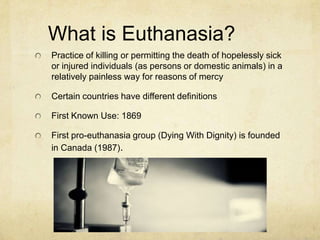 This document discusses euthanasia and its definitions, forms, pros, cons, and statistics. Euthanasia is defined as killing or permitting the death of hopelessly sick or injured individuals for reasons of mercy. There are different forms including voluntary, passive voluntary, non-voluntary, and involuntary euthanasia. Pros listed are allowing patient choice in death, transitioning on their own terms, preventing embarrassment, and decreasing healthcare costs. Cons discussed are the moral issues of devaluing life, risk of doctor mistakes, impacts on those unable to consent, religious objections that it is murder, and potential advances that could save a life. The document ends with questions about the potential positive or negative impacts of euthan