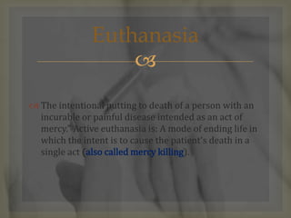 This document discusses euthanasia and its classification, definitions, and status in various countries. It defines euthanasia as intentionally ending a person's life to relieve suffering from an incurable disease. Euthanasia can be active, such as lethal injection, or passive, such as refusing life-sustaining treatment. It also defines voluntary, non-voluntary, and involuntary euthanasia based on patient consent. The document outlines euthanasia laws and cases in countries like the Netherlands, India, Pakistan, China, and the United States.