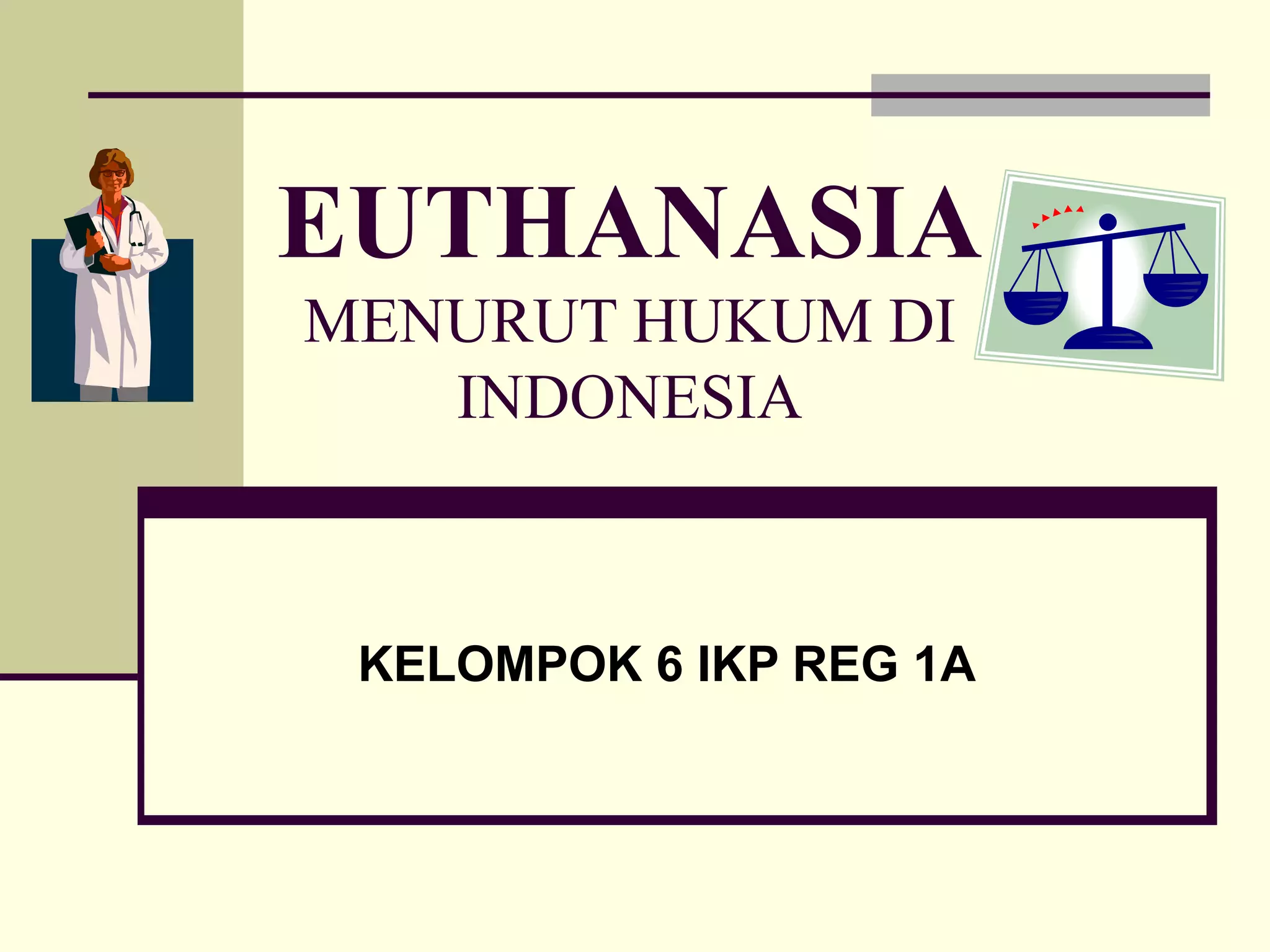 Euthanasia di Indonesia diartikan sebagai tindakan mengakhiri hidup pasien demi mengurangi penderitaan, dengan izin dokter. Terdapat perbedaan jenis euthanasia, yaitu aktif dan pasif, yang dipengaruhi oleh hukum serta etika medis, di mana tindakan ini masih dapat dianggap ilegal di bawah hukum pidana. Agama juga melarang euthanasia, dengan menekankan bahwa hidup dan mati adalah prerogatif Tuhan.