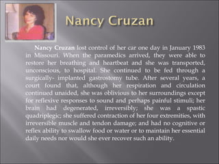 Nancy Cruzan was in a car accident in 1983 in Missouri that left her in an unconscious, persistent vegetative state. She was kept alive through a feeding tube for several years until a court determined she had no cognitive ability and would not recover, leaving her family to decide on removing her feeding tube.
