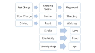 This document proposes a concept called "Electronic Vehicle Pets" to provide entertainment for EV drivers while their vehicles are charging. The system would allow drivers to raise a virtual pet on their car's screen only during charging. Raising different endangered animal pets could help create an emotional bond while educating users. The concept aims to make lengthy charging times more enjoyable and give a sense of environmental contribution. Diagrams show how a pet would appear when plugged in and disappear upon unplugging, and drivers could feed, play with toys, and stroke their pet during a charge.