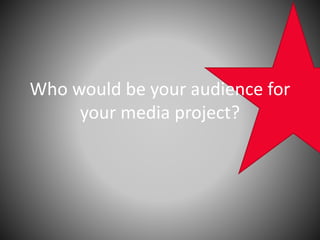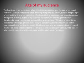 The target audience for the magazine is 16-19 year old males and females interested in indie music. Primary research was conducted through a Facebook group of the target audience to determine preferences like color themes and spending habits. A stereotypical reader profile was created of a full-time student interested in music, fashion, and gigs who spends £30-90 per month on luxuries. Individual male and female target profiles were also created to understand their specific interests to appeal to them. The key reasons identified that this audience would choose the magazine are for entertainment, gig information, discovering new music, fashion inspiration, and if their favorite artists are featured.