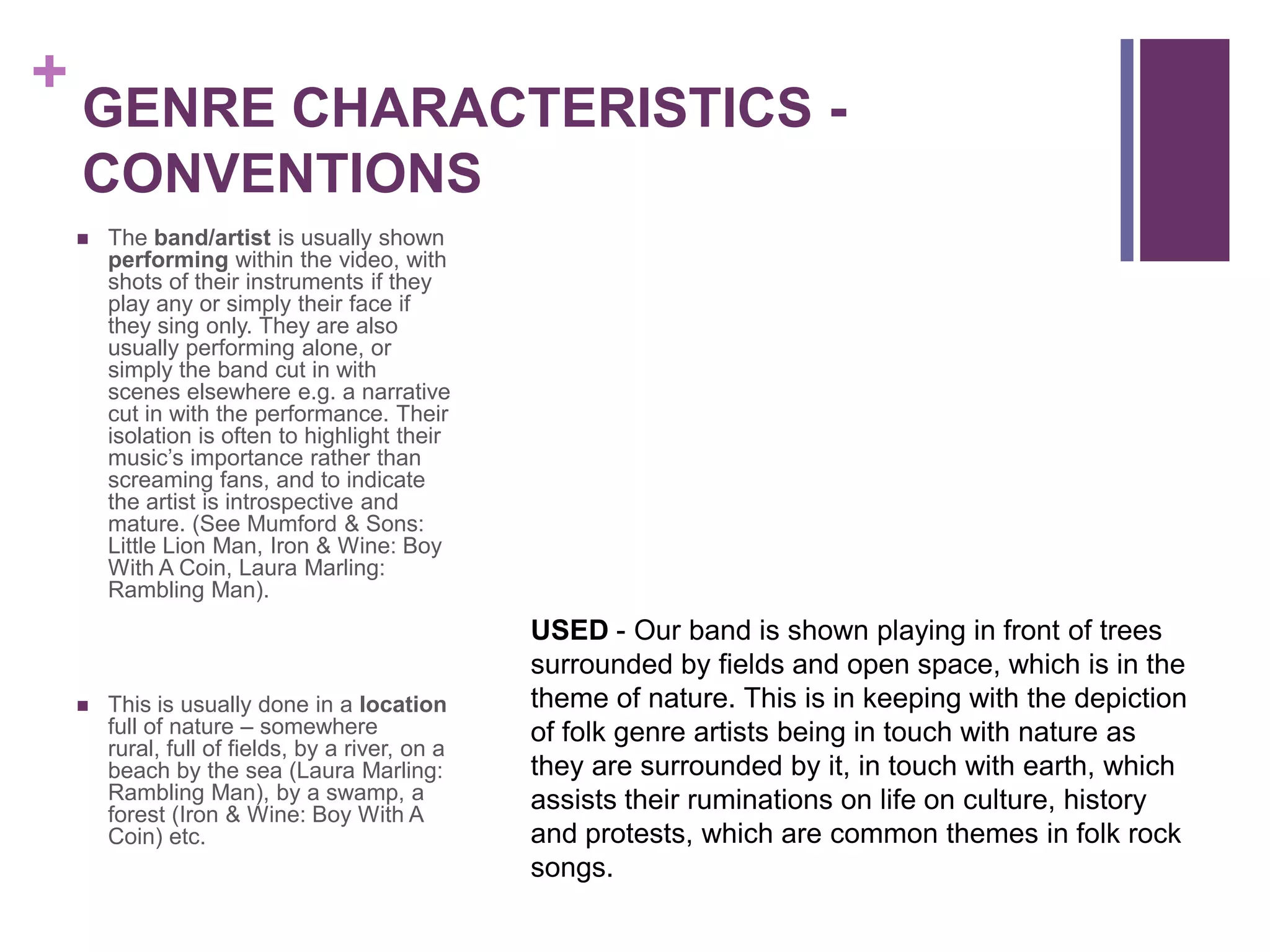 The document discusses conventions and characteristics of folk rock music videos. It analyzes how several videos use, develop, or challenge conventions. Key points: