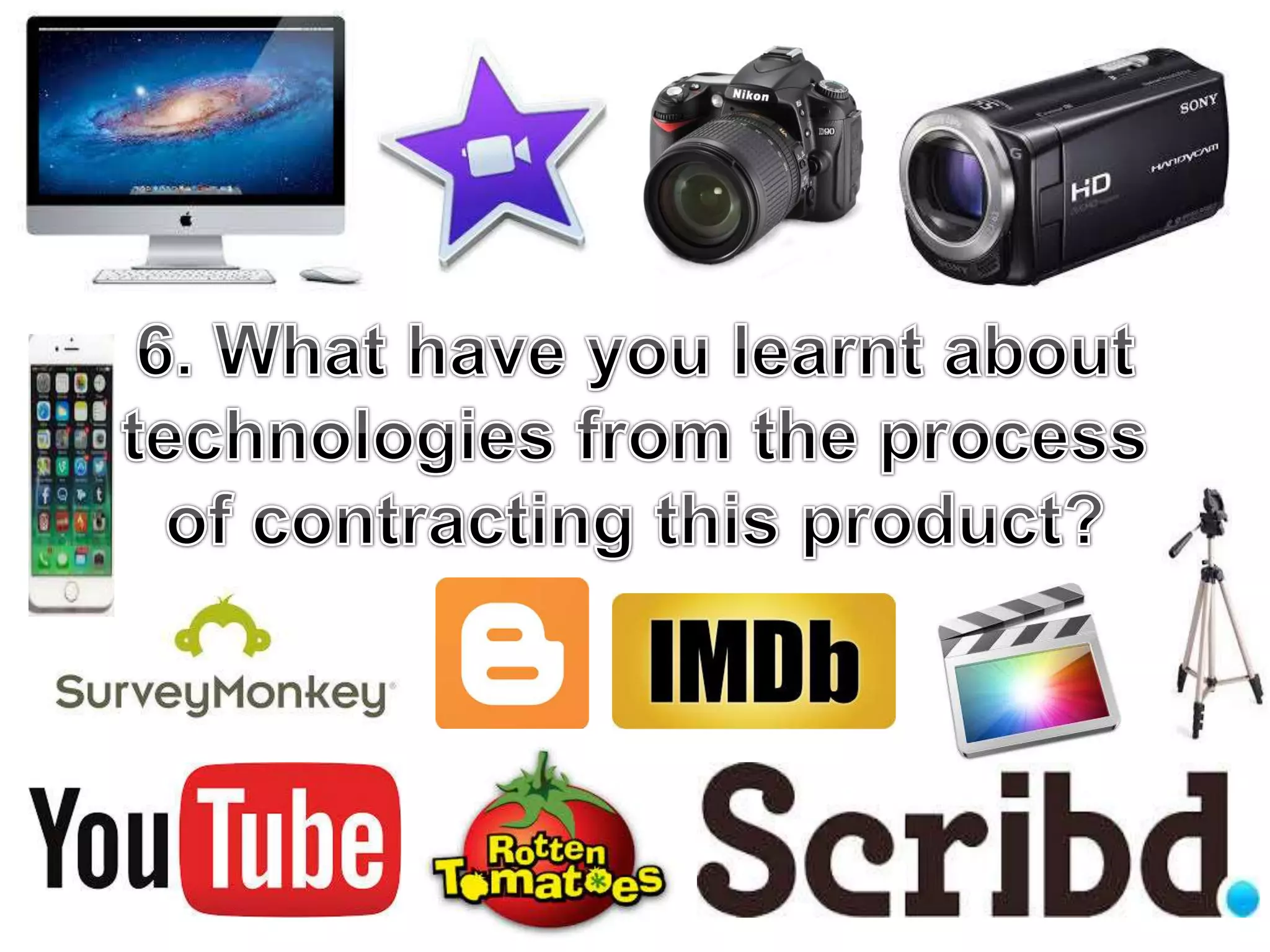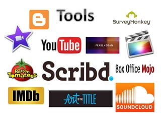 - Software like iMovie, Final Cut Pro, YouTube, Blogger, Scribd, SurveyMonkey and Pearl & Dean for editing, sharing, research.