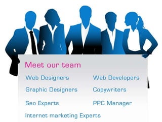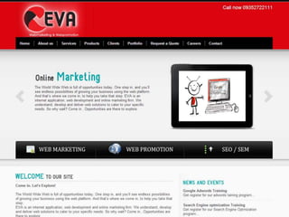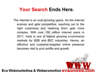 The document discusses the importance of an effective online presence for businesses. It notes that as the internet becomes more competitive, reaching and retaining customers online becomes more complex. It then promotes the services of EvaOnWeb to help businesses strengthen their online presence through search engine optimization, internet marketing, and continuous analysis of website data to ensure effectiveness. EvaOnWeb can help businesses get the right customers through an optimized online strategy.