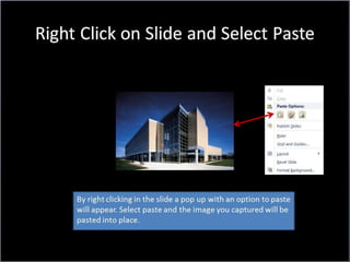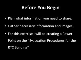 The document provides instructions for creating a PowerPoint presentation on evacuation procedures for an RTC building. It explains how to open PowerPoint, add slides, insert text, images and change themes. The presentation includes slides outlining evacuation procedures for different floors of the building, with images and text. The last slide concludes the presentation and asks for questions. The summary is presented in 3 sentences or less.