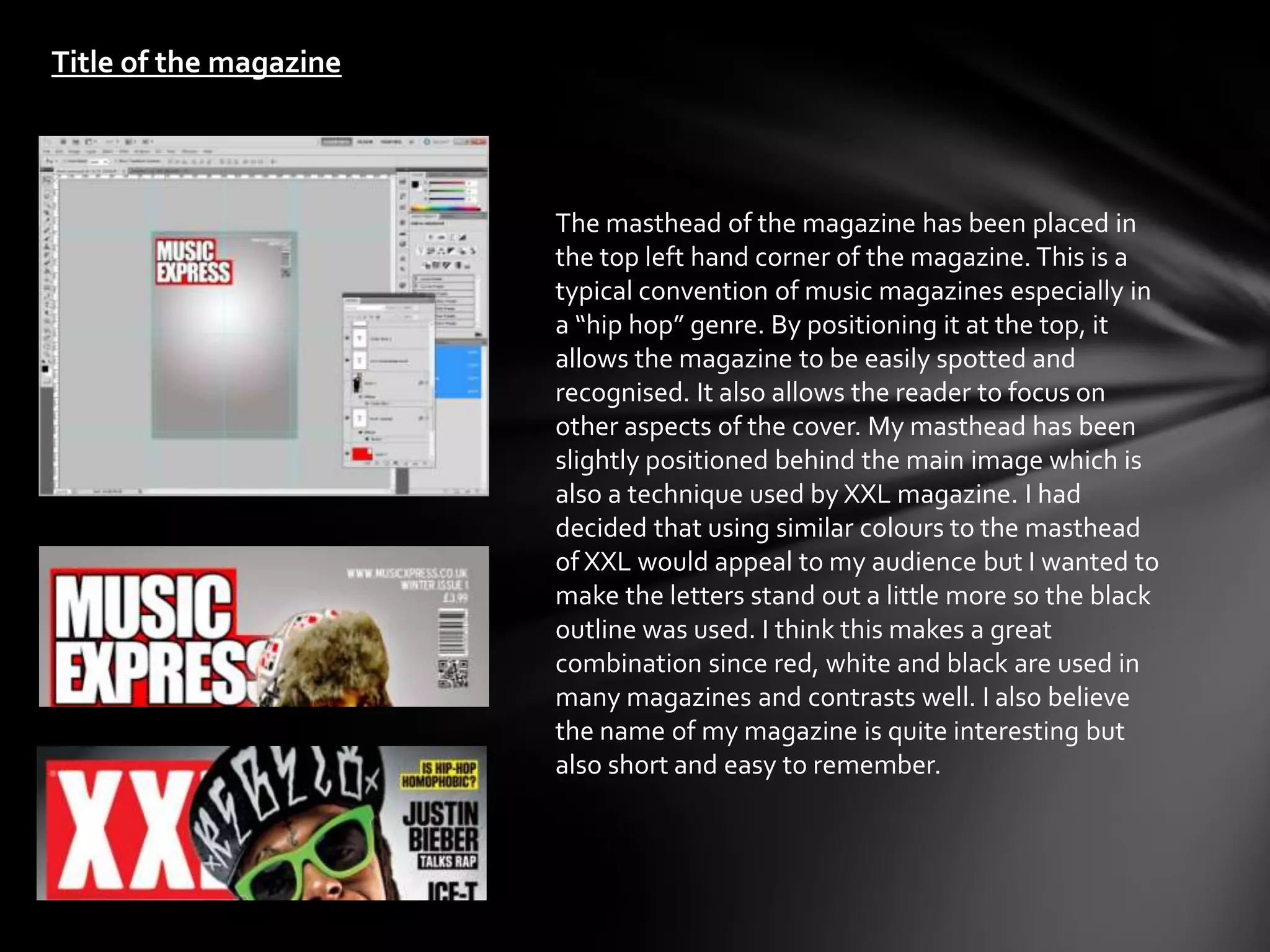 The document discusses how the student's media magazine product uses and develops conventions of real music magazines.