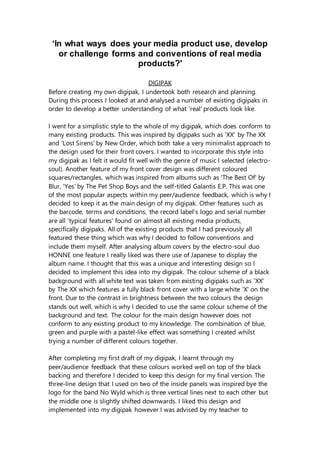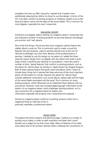 This document summarizes how the author's media products of a digipak, magazine advertisement, and music video used, developed, and challenged conventions of real media products in various ways. For the digipak and magazine ad, the author researched existing examples to incorporate typical features but also added some unique elements. The music video took inspiration from Tom Odell's "Another Love" video in its staging and shots but challenged conventions by not including a female subject and keeping full focus on the artist.