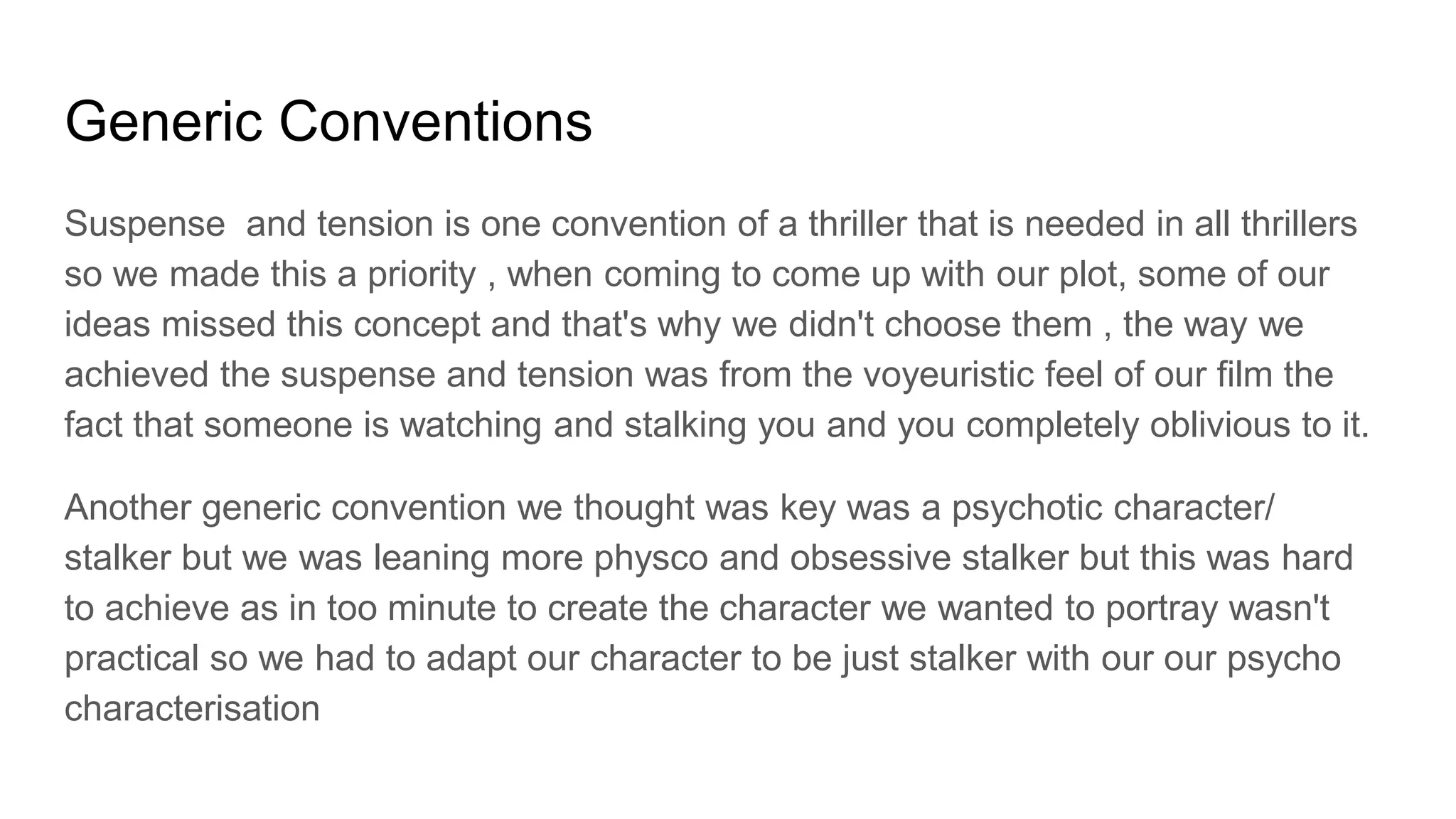 This document discusses several generic conventions and challenges of thrillers that the filmmakers considered in their short film. They prioritized including suspense and tension through a stalker voyeuristically watching the main character. Their psychotic stalker character was difficult to portray within the short time constraints. The filmmakers also challenged the convention of only having male detectives by not including strong male characters or actors. They ultimately titled their film "The Hunted" because audience feedback suggested it sounded creepy and precise for the stalker character. The main prop of a phone was used to create significance and foreshadowing. Practical location issues forced changes to the originally planned setting of filming across from houses, but the new woodland location still fulfilled thriller