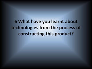 The document discusses technologies used during the process of creating a film project. Celtx was used to write the script quickly and efficiently. Microsoft Word allowed for organizing shot lists and other information in an easy to use grid format. Filming the preliminary task helped the students learn how to effectively use the camera, fixing any issues so that filming the main task went smoothly. Final Cut Pro was used to edit the film, allowing the students to work collaboratively to craft professional-looking scenes. YouTube provided a platform to upload and get feedback on the completed film.