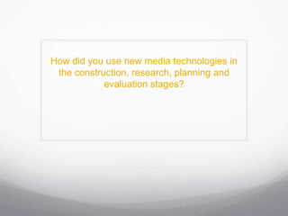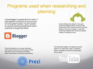 The student used various new media technologies at different stages of their project. They used Blogger to upload and share work, Survey Monkey to collect feedback, Prezi for interactive presentations, YouTube to upload and analyze videos, and Microsoft Office for writing. Photoshop, Premier Pro, and After Effects were used to create a poster, trailer, and edit videos. Hardware included a Mac for editing and a Canon camera for photos and videos. The student felt they had progressed in their skills and confidence using these technologies from the previous year.