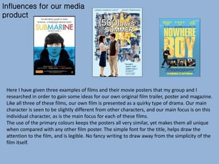 This document summarizes the influences and conventions used in creating an original film trailer, poster, magazine, and other marketing materials for a student media project. It discusses influences drawn from real film posters like Submarine and 500 Days of Summer, including use of focal images, consistent fonts, and reviews. Film trailer conventions like character introductions, relationship shots, and end credits are also examined. The document outlines the ident, magazine cover design, and color palette used, citing influences from actual film companies and magazines like Total Film. Overall, the document shows how the student media project draws from established conventions while developing its own distinct visual identity and style.