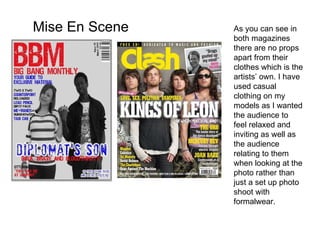 The document discusses various design elements used in magazines, including direct address, mise-en-scene, master heads, color schemes, cover lines, puffs, and floating quotes. The author analyzes how they employed these elements in their own music magazine photoshoot, comparing their techniques to popular magazines like NME and Q to attract readers while maintaining a unique style.