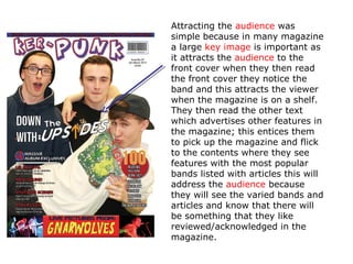 The magazine attracts its audience through large images and prominent coverage of popular bands on the front cover. Additional text highlights other articles inside to entice readers to purchase the magazine. Bright colors and layout also make the magazine stand out visually. The headline and inclusion of many well-known pop punk bands are intended to attract fans of those artists to read about their favorite bands. Reviews of new pop punk bands help attract new fans and build trust in the magazine over time. Free posters of featured bands provide additional value for readers and incentive to continue purchasing issues that include their favorite artists.