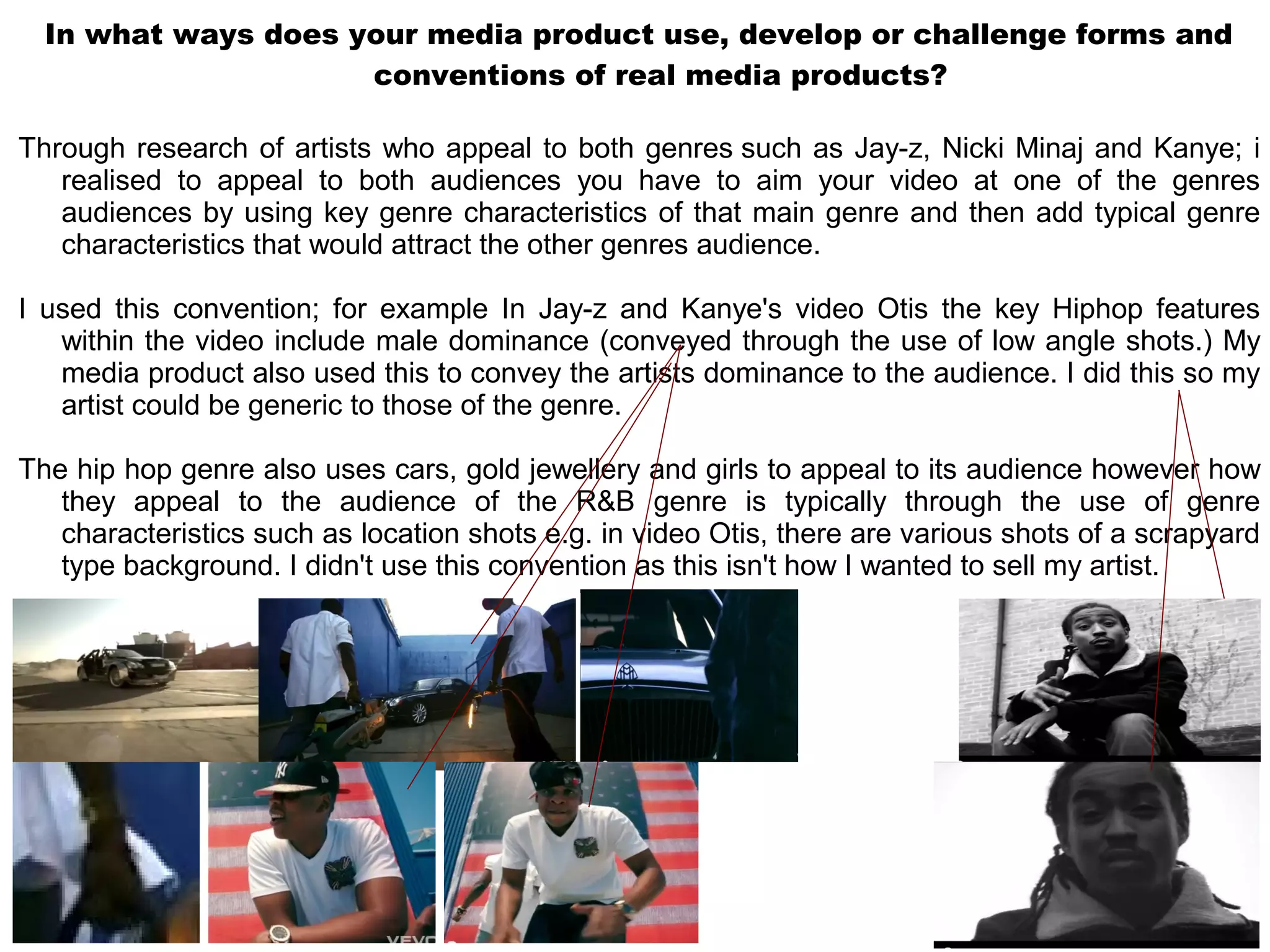 The document discusses how the media product uses and develops conventions of real hip hop and R&B music genres. It uses conventions like illustrating the relationship between music and visuals. It challenges some conventions like not using typical male costumes or props. Locations and shots are chosen to reflect the song's message and mood rather than just following genres. The goal is to blend genres to appeal to both audiences while keeping the artist's individual style.
