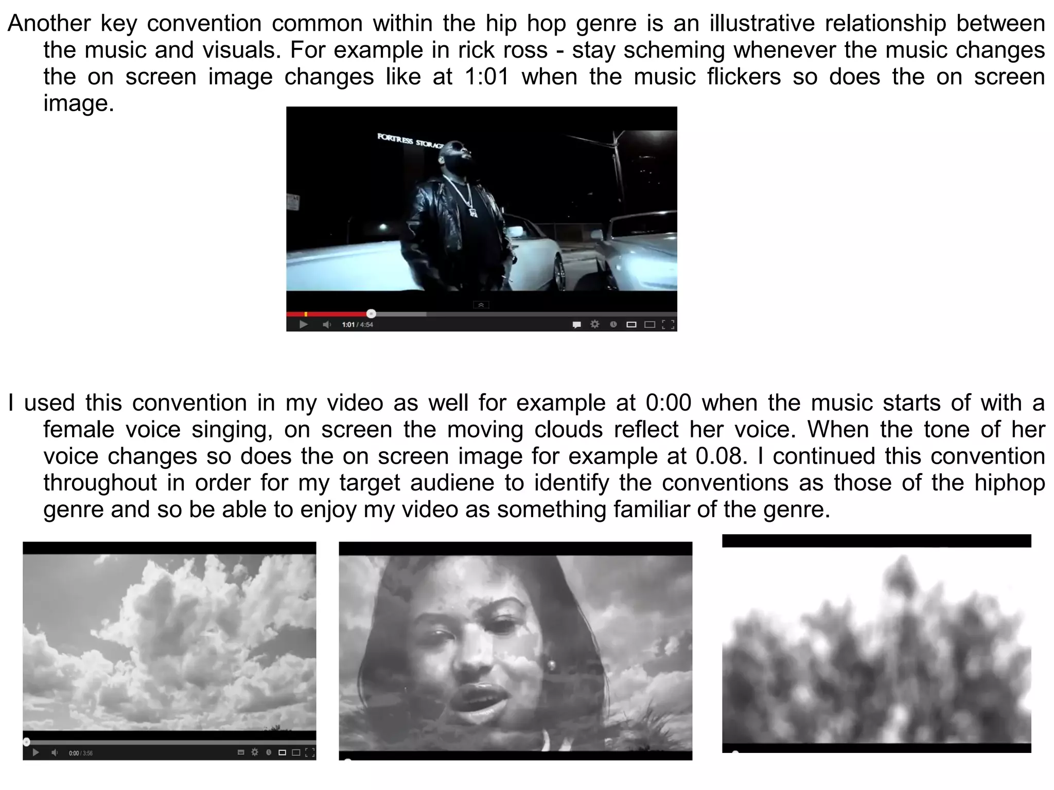 The document discusses how the media product uses and develops conventions of real hip hop and R&B music genres. It incorporates conventions such as illustrating the relationship between music and visuals. It challenges some conventions like not using expensive props typical of hip hop. Locations and costumes are chosen to reflect the song's message and sell the artist effectively rather than follow genres strictly. The goal is to blend genres and appeal to both hip hop and R&B audiences.