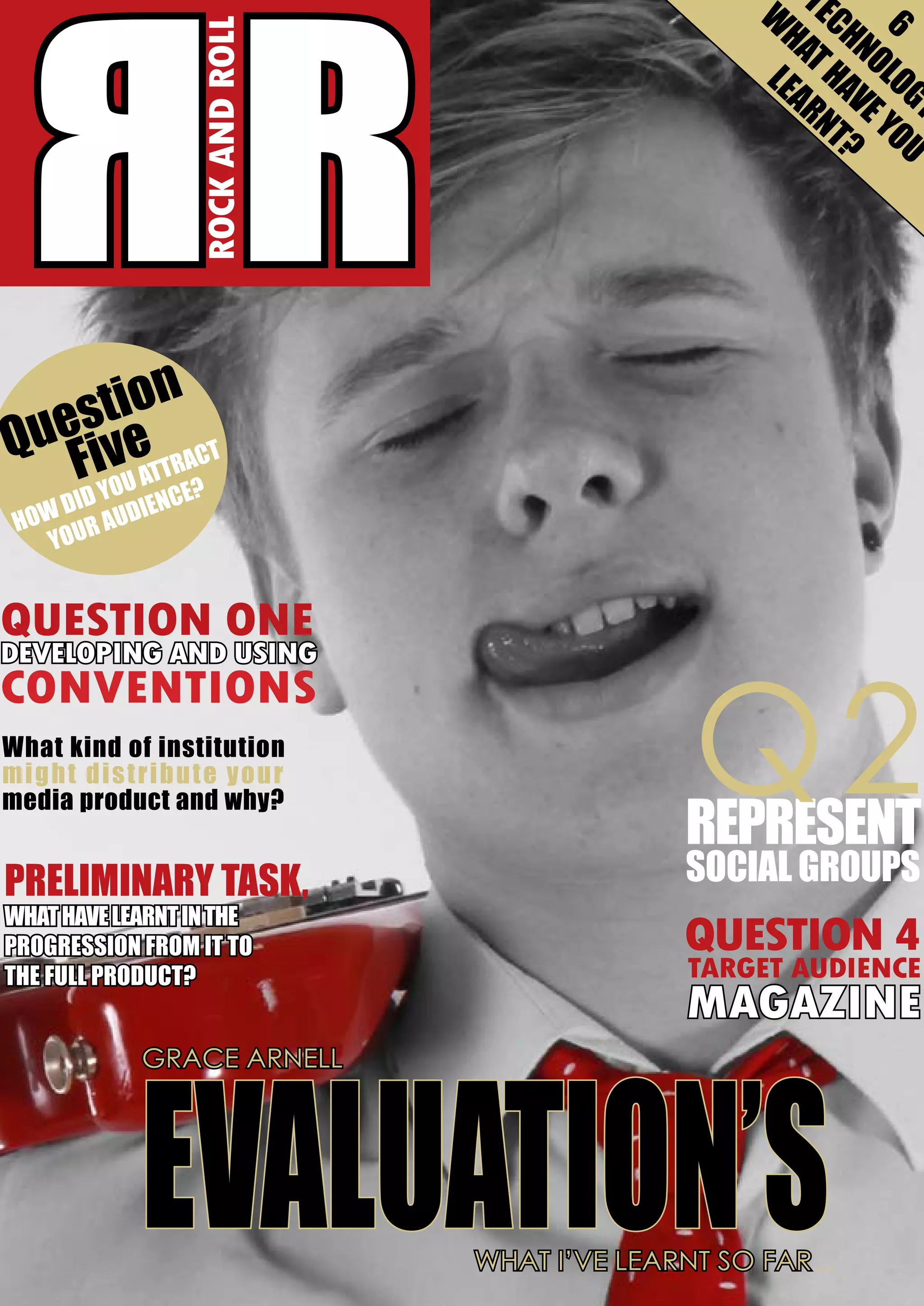 This document discusses the design of a magazine called "Rock and Roll" and how it uses conventions from real music magazines. It begins by explaining how the designer studied magazines like Rolling Stone and NME to inform the layout and style. Key design elements discussed include using a black and white close-up image on the cover, a red masthead in the top right, and inclusion of articles, reviews, and a gig listing. Color schemes and fonts were chosen to represent the target audience and genre of soft rock music. Overall the document analyzes how the magazine design adheres to typical magazine conventions to create a realistic product.