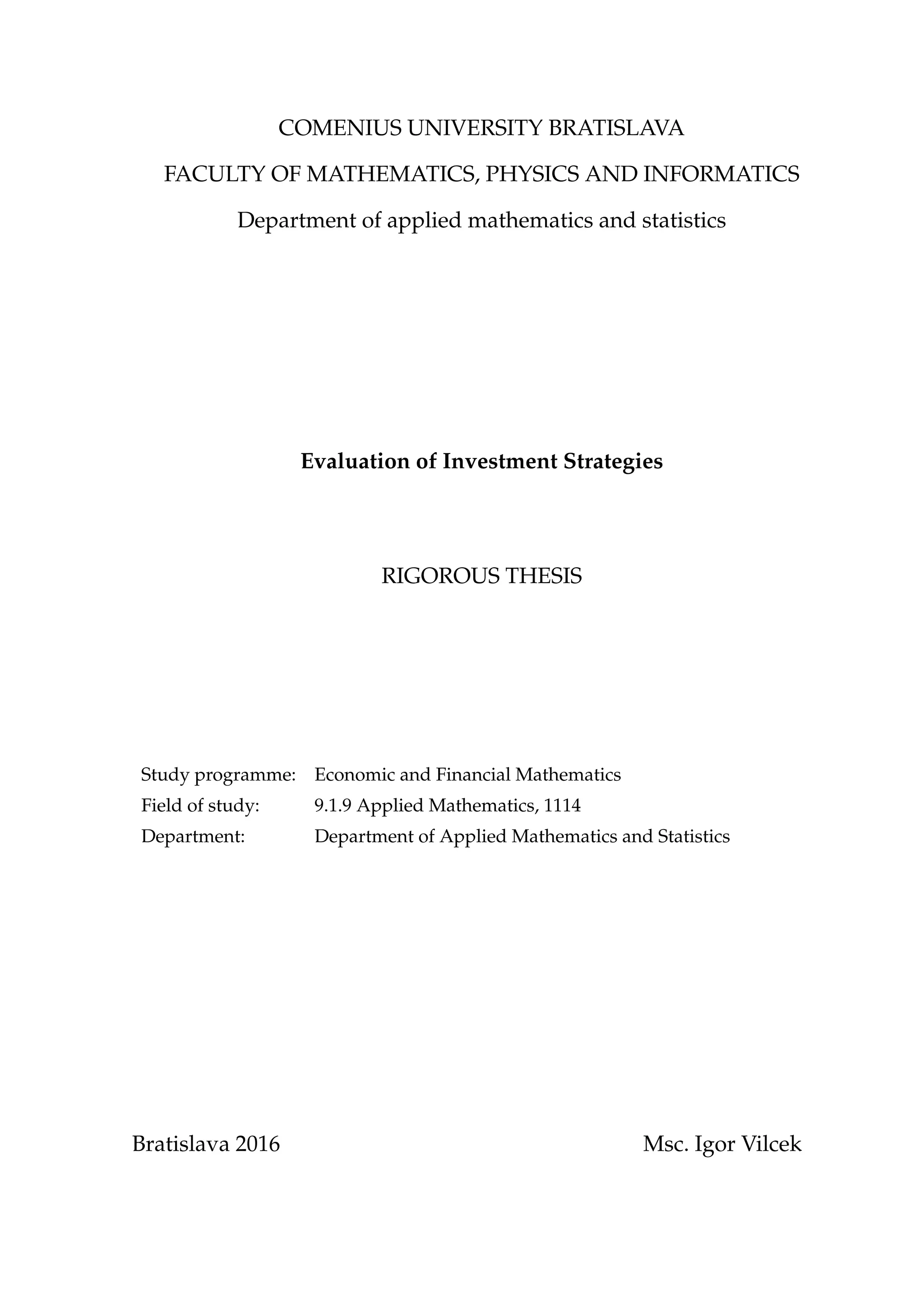 This document is a thesis that evaluates investment strategies. It first reviews literature on performance evaluation measures. It then defines and describes various return, risk, return-to-risk, benchmark, and other quantifiable measures to evaluate past investment performance. It discusses potential misuses of these measures and stresses the importance of evaluating measures together. It also covers non-quantifiable evaluation criteria. Finally, it applies the discussed performance measures and principles to evaluate the past 10 years of Slovak equity pension funds.