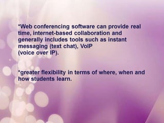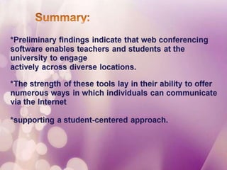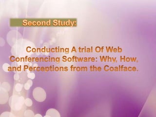 This document discusses web conferencing software and how it has evolved since 2009 to better support library services. While the technology is not new, its performance has improved to better meet expectations. The document introduces the topic of using web conferencing software for library services.