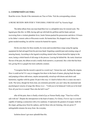 This document contains a student's language assessment scores from October to June in the areas of reading, listening, writing, and oral skills. It also includes two reading comprehension exercises, one about a music review of the album "For Emma, Forever Ago" by Bon Iver and the other instructing the listener to number movie titles mentioned in an audio podcast.