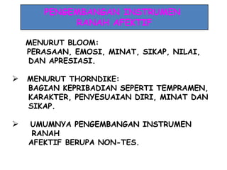 Dokumen ini membahas pengembangan instrumen untuk menilai ranah afektif dalam pendidikan, termasuk indikator, tipe skala, dan metode pengukuran yang digunakan. Terdapat berbagai contoh format penilaian melalui observasi dan rating scale untuk mengukur sikap dan minat siswa terhadap mata pelajaran Pendidikan Agama Islam. Selain itu, dokumen ini juga mencakup teknik penskoran dan contoh penerapan dalam konteks portofolio dan penilaian psikomotor.