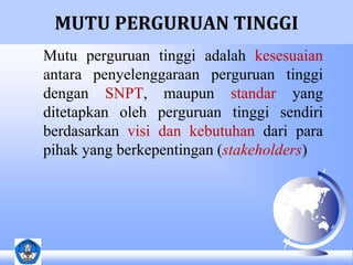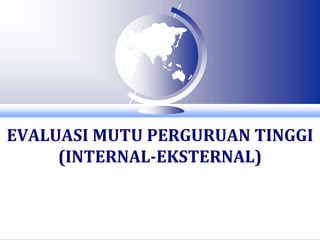 Dokumen tersebut membahas evaluasi mutu perguruan tinggi, baik evaluasi internal maupun eksternal. Evaluasi internal dilakukan oleh perguruan tinggi sendiri untuk mengukur pencapaian standar mutu dan melakukan perbaikan berkelanjutan, sedangkan evaluasi eksternal dilakukan oleh lembaga di luar perguruan tinggi untuk mengetahui posisi mutu perguruan tinggi terhadap standar mutu eksternal dan mendorong perbaikan mutu. Kedua evalu