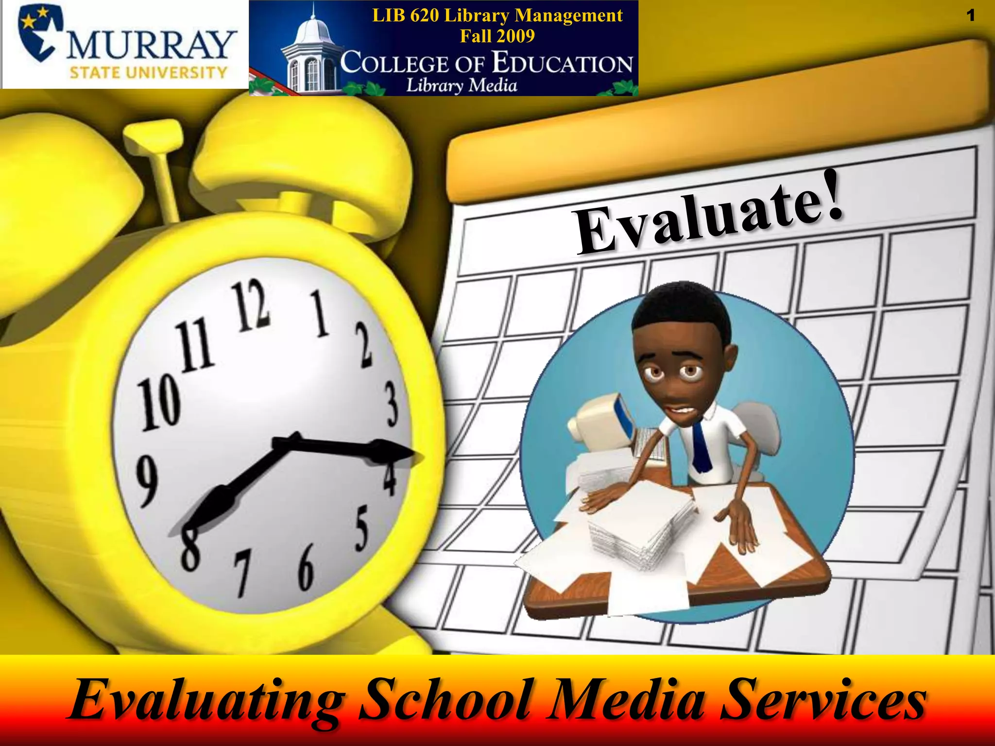 This document discusses evaluating school library media programs. It provides definitions of evaluation, purposes of evaluation such as improving services and demonstrating value, and types of data that can be collected including quantitative and qualitative data. The document also presents an evaluation model including defining questions, collecting and analyzing data, formulating recommendations, and developing an action plan. Methods of evaluation discussed include questionnaires, observation, and focus groups. Challenges of evaluation in a school context and potential solutions are also outlined.