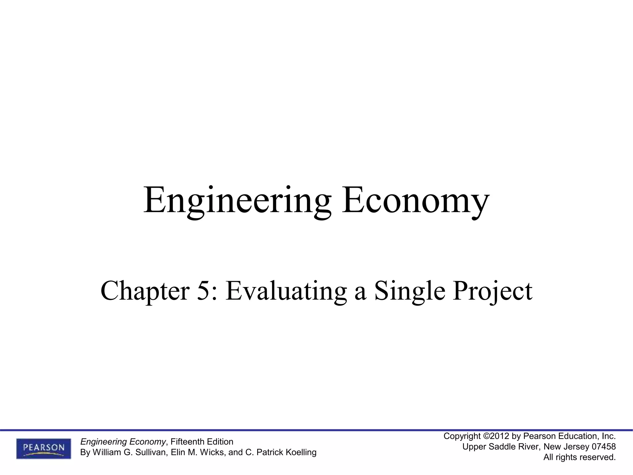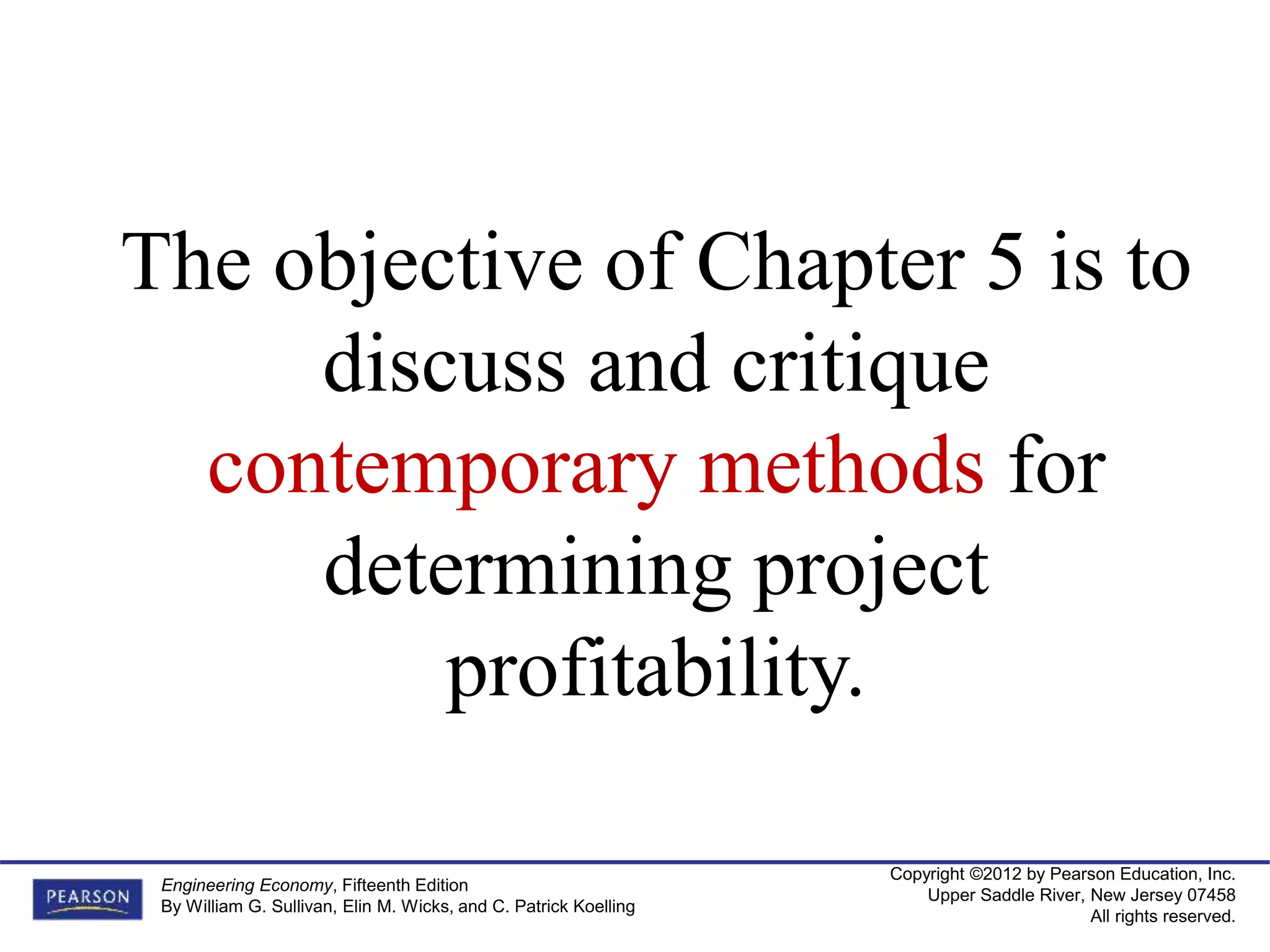 Chapter 5 of 'Engineering Economy' focuses on evaluating project profitability through methods such as present worth (PW), future worth (FW), annual worth (AW), internal and external rates of return (IRR and ERR), and payback period. The Preferred method is present worth, which shows the net cash flow in relation to a minimum attractive rate of return (MARR). The chapter also discusses examples such as bond valuation and capitalized worth, illustrating how to apply these economic analysis techniques.