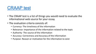 This document evaluates a website about Martin Luther King Jr. using the CRAAP test criteria. It finds that while the information is relevant and from a .org domain, indicating authority, the sources cannot be traced back to original authors due to a lack of proper citations. As a result, the accuracy of the information cannot be confirmed, failing the accuracy portion of the CRAAP test and making the entire website not credible.