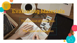 This document discusses the evaluation and adaptation of materials in English Language Teaching (ELT), emphasizing the importance of assessing both external and internal factors of materials to meet teachers' and students' needs. It highlights the need for teachers to understand how to adapt materials based on context and identifies principles and techniques for effective adaptation. Additionally, it explores the role of technology in enhancing teaching practices and fostering language skills.