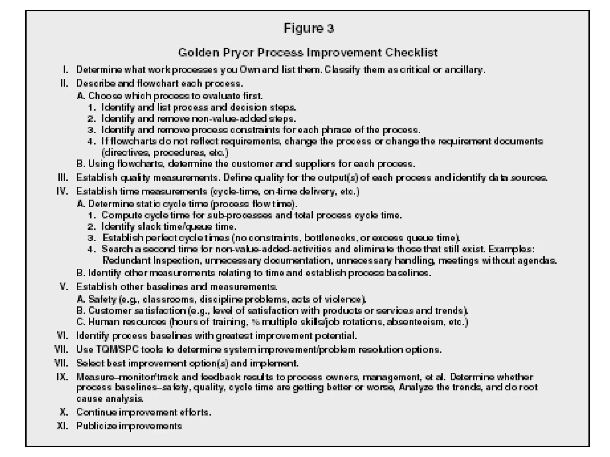 The following aresome of the things people can do to improve processes: Use a structured methodology such as the Golden-Pryor Improvement Checklist. Eliminate activities that do not add value for the customer. Ask yourself: "Would the customer want to pay for this activity?" If the answer is no, ask yourself: "Why are we doing this? Is it a federal law? A state law?" If the answer is no, ask yourself: "What benefit do we gain by doing this?" At this point, you are coming close to eliminating the activity. Eliminate constraints—things that frustrate employees and slow processes. Streamline/simplify processes. It is difficult to document and teach people complex processes.