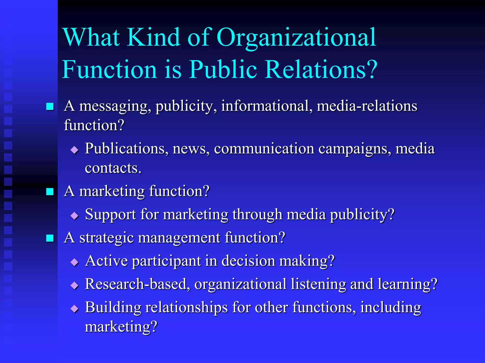 This document discusses different ways to evaluate and measure the effects of public relations. It begins by outlining three common paradigms for what public relations functions as - a messaging function, marketing function, or strategic management function. The document argues public relations is best understood as a strategic management function that builds relationships.
