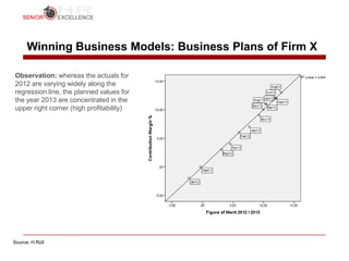 This document discusses evaluating business plans and models. It outlines an approach to analyze a firm's past performance and key drivers of success. These drivers are then used to study how well the business plan forecasts correlate with projected performance in future planning periods. As an example, the document shows charts comparing an unnamed Firm X's actual past performance data to its optimistic planned values for profitability, which exceed actuals by a factor of 5-6 despite unchanged key drivers.