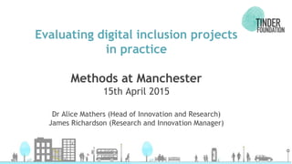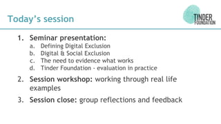 This document outlines a seminar presentation given by Dr. Alice Mathers and James Richardson of Tinder Foundation on evaluating digital inclusion projects. It discusses defining digital and social exclusion and their overlap, as well as the need to evidence what intervention strategies are effective. Two case studies are presented: an eReading Rooms project and a Vodafone mobile devices initiative. Attendees then participate in a workshop designing evaluation frameworks for sample digital inclusion projects focusing on aims, methods, outcomes, and adding value.