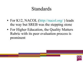 The document discusses quality assurance processes for online courses, focusing on the Quality Matters Rubric. The Quality Matters Rubric is a peer-review process used to certify and improve the quality of online courses. It consists of forty specific elements across eight standards. Courses must meet all essential standards and earn over 72 points to pass review. The document also discusses additional ways the university evaluates its online courses, such as surveys and student practicums assessed with the Quality Matters Rubric.
