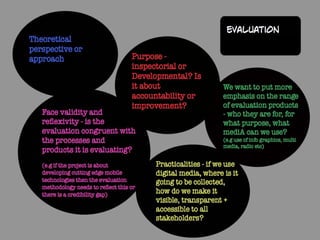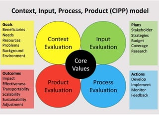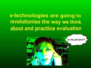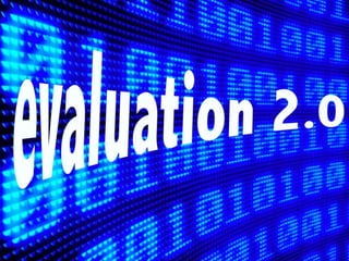 This document discusses evaluating e-learning programs. It defines evaluation as a joint learning process that generates useful knowledge by systematically assessing the relevance, efficiency, and effectiveness of policies, projects, and programs. Evaluation involves defining why it's being done and can take different theoretical perspectives like rationalist-positivist or constructivist. Key dimensions of evaluation include indicators, data collection tools, performance criteria, standards, and products. Evaluating e-learning may differ in aspects like reflexivity, authenticity, tools used, stakeholders involved, and range of data and products. Evaluation outputs can be localized and content repurposed in digital form.