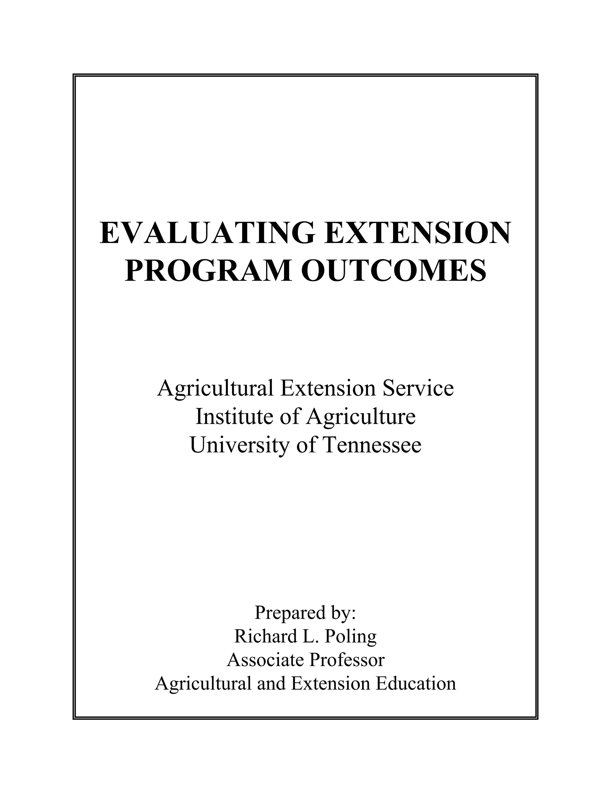 This document provides guidance on evaluating extension program outcomes. It discusses identifying the appropriate sources of information, determining what information is needed, and collecting data in the right way. The key aspects are to ask the right people, for the right information, in the right way. The right people are those affected by the program, like participants. The right information addresses the program's objectives and expected outcomes. It should be collected using appropriate methods, balancing ideal data with available resources. Objectives and a model for program outcomes, the Bennett/Rockwell TOP Model, can guide the evaluation process.