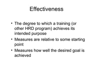 The document discusses evaluating the effectiveness of human resource development (HRD) programs. It describes common purposes of evaluation such as determining if a program is meeting objectives and identifying strengths and weaknesses. Kirkpatrick's four-level model of evaluation involving reaction, learning, behavior, and results is discussed. Data collection methods that can be used for evaluation like interviews, questionnaires, and observations are also outlined.